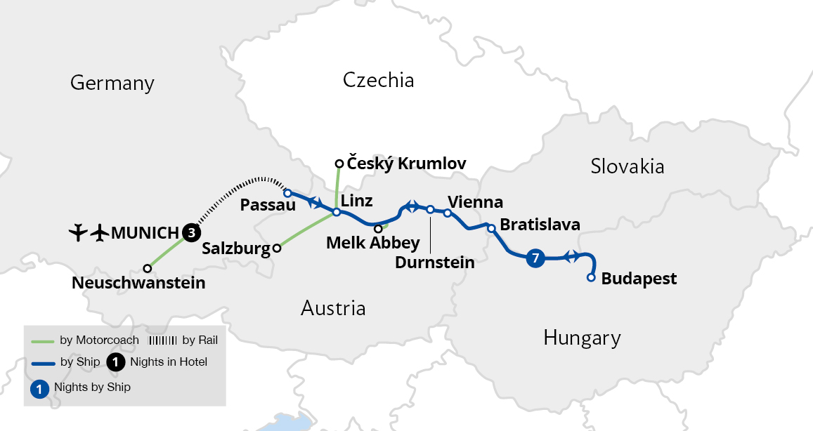 Fly to and from Munich to enjoy a leisurely cruise through four countries and three capital cities, basking in beautiful river scenery all the way. Sail from the German border town of Passau through the Austrian wine-growing region of the Wachau Valley, admiring picturesque Dürnstein and commanding Melk Abbey enroute. After exploring ...