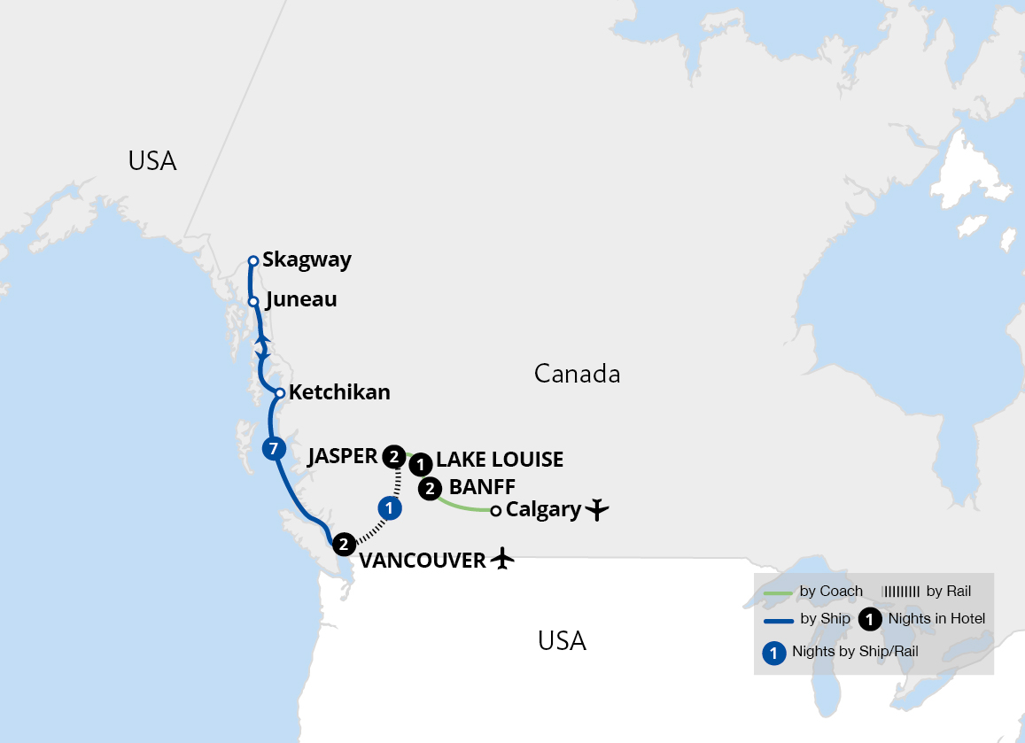 Experience the breathtaking beauty of Canada and Alaska on an unforgettable journey by land and sea. From the picturesque town of Banff, admire the beauty of Lake Louise and view the Athabasca Glacier before boarding the iconic Rocky Mountaineer, taking in breathtaking scenery on one of the world's most scenic railways as we journey to...